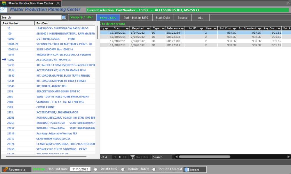 Once you have decided on a sales forecast, MPS results allow you to visualize your forecast before committing to it – providing valuable insight into how to plan and schedule your operation to maximize customer satisfaction and your profitability. You can sort your MPS by part number, job number, reference document (Sales Orders, MPS), start date, required date, etc. to facilitate quick analysis.